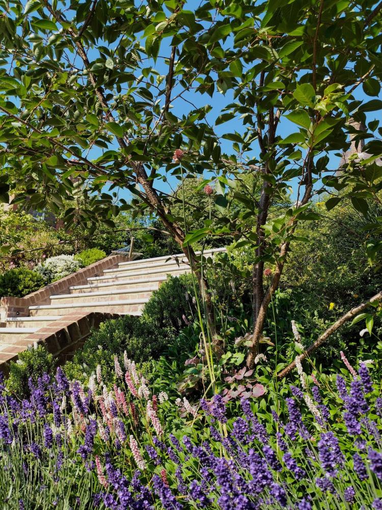 Solution: The garden has been successfully terraced and divided into multiple usable spaces, allowing enjoyment of the various areas at different times of day and created many spaces to take in the stunning views of the river and meadows beyond.